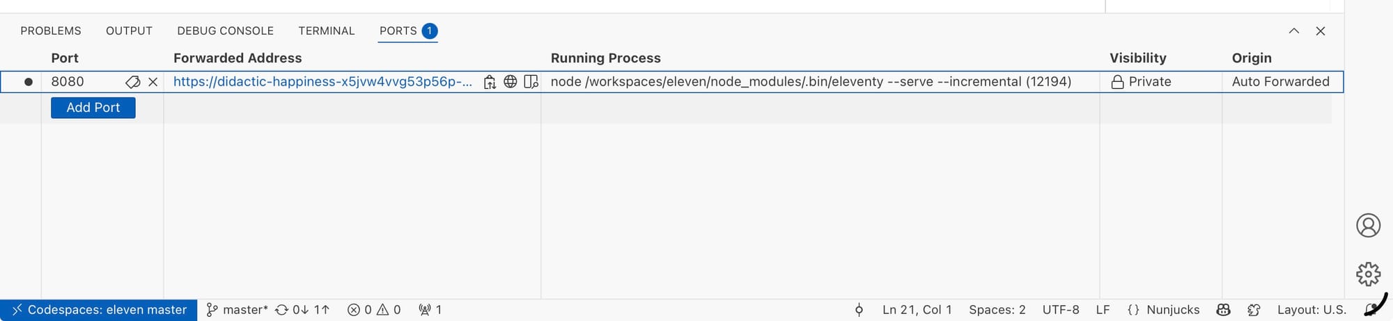 This is handled by running your normal run command (mine is npm run dev), which VS Code/Codespaces will detect, and then provide automatic port forwarding so you can access it directly.