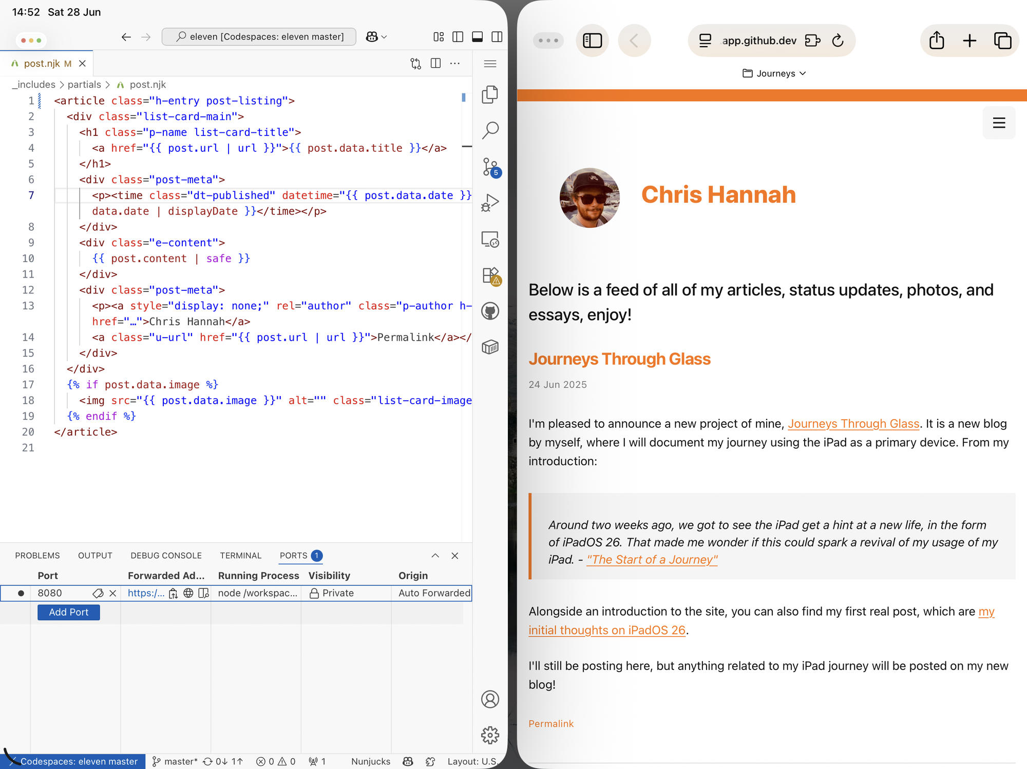 My favourite part of using Codespaces is that I can also use it to quickly spin up an instance of my blog, get a live preview, and then deploy to production. So I can work on my blog design/post on one side of my iPad, and then have it rebuild automatically and show in the browser on the right.
